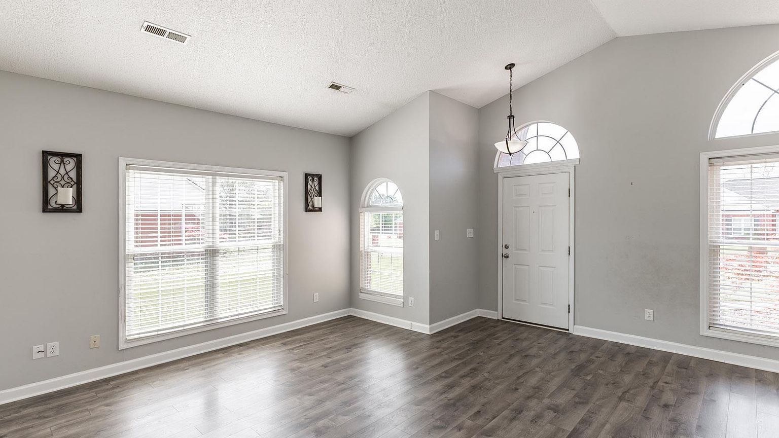 This bathroom retreat combines functionality with refined aesthetics, featuring a dual-sink vanity with speckled countertops. White cabinetry offers abundant storage, while bronze-framed mirrors and ornate lighting add character. The walk-in shower showcases textured glass panels and brushed nickel hardware, with a glass block window providing natural light.