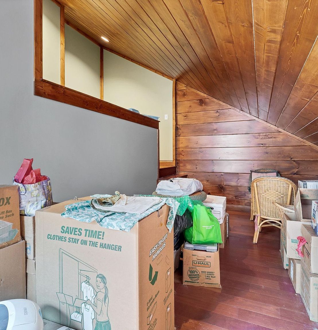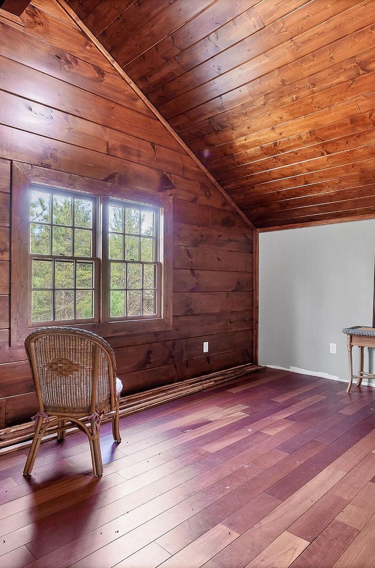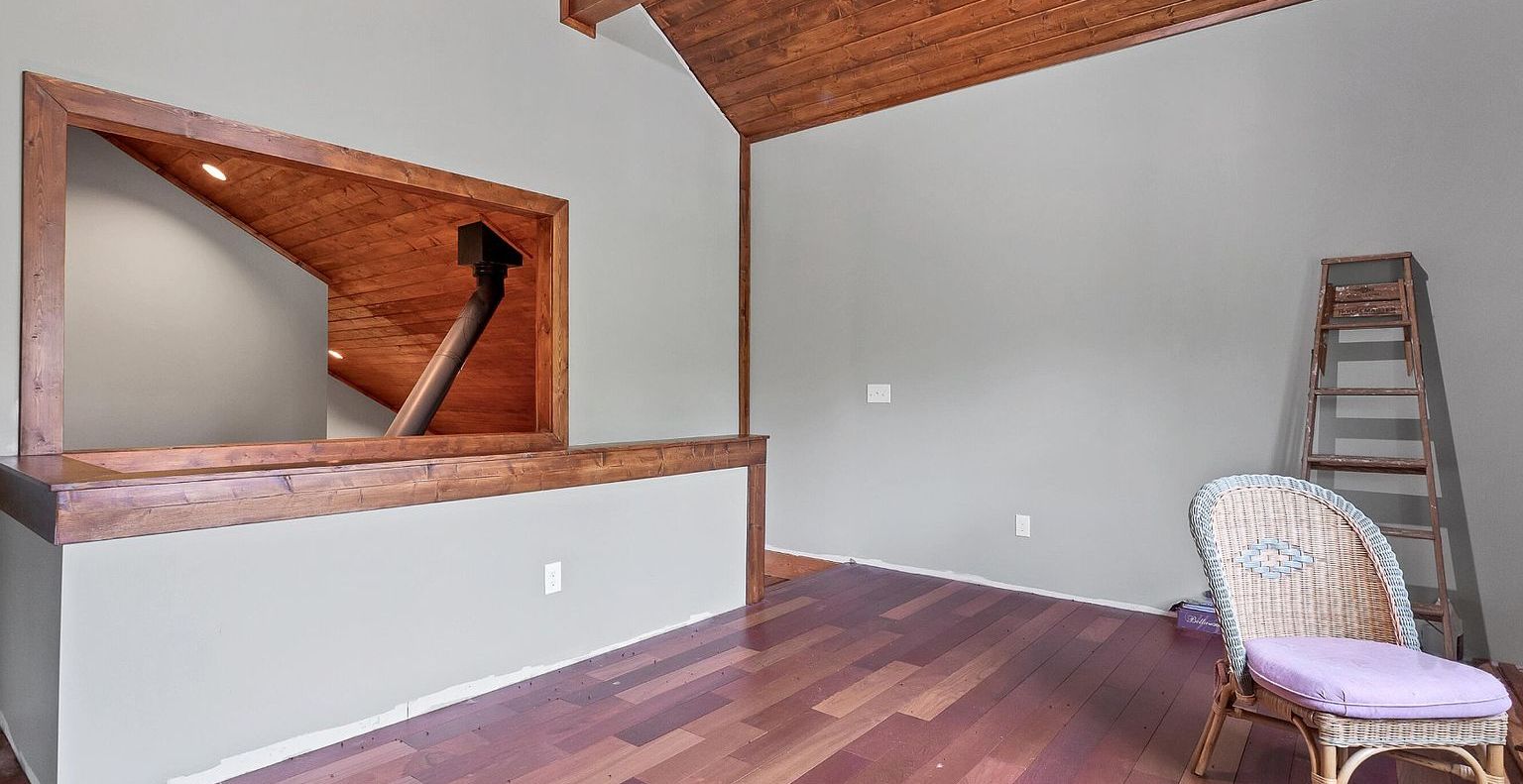 The heart of this home showcases soaring 26-foot cathedral ceilings adorned in honey-toned wood planking, creating an expansive yet cozy atmosphere. A stunning floor-to-ceiling stacked stone wall anchors the wood-burning stove, perfect for warming chilly mountain evenings. French doors with elegant mullioned glass connect seamlessly to the sunroom, flooding this gathering space with natural light.