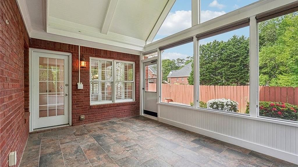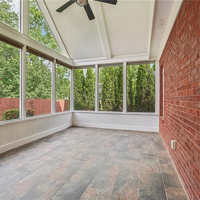 This sunroom is where the magic happens—your personal retreat with vaulted ceilings and walls of windows overlooking the wooded backdrop. Watch wildlife pass by as you enjoy your morning coffee or unwind after a long day. The brick accent wall and tile flooring create a space that feels both cozy and connected to nature.