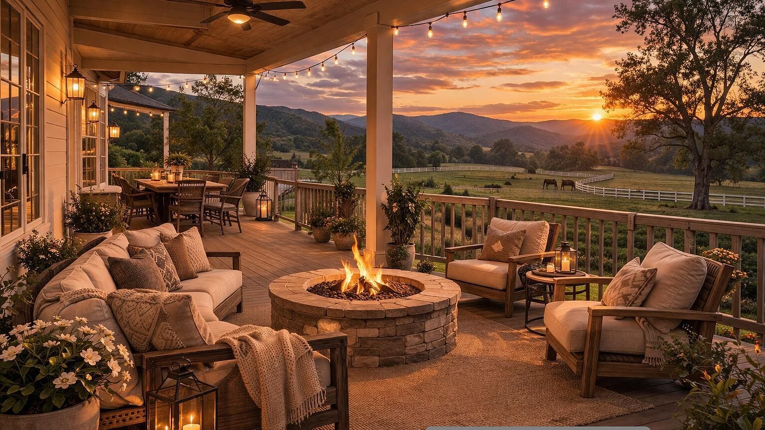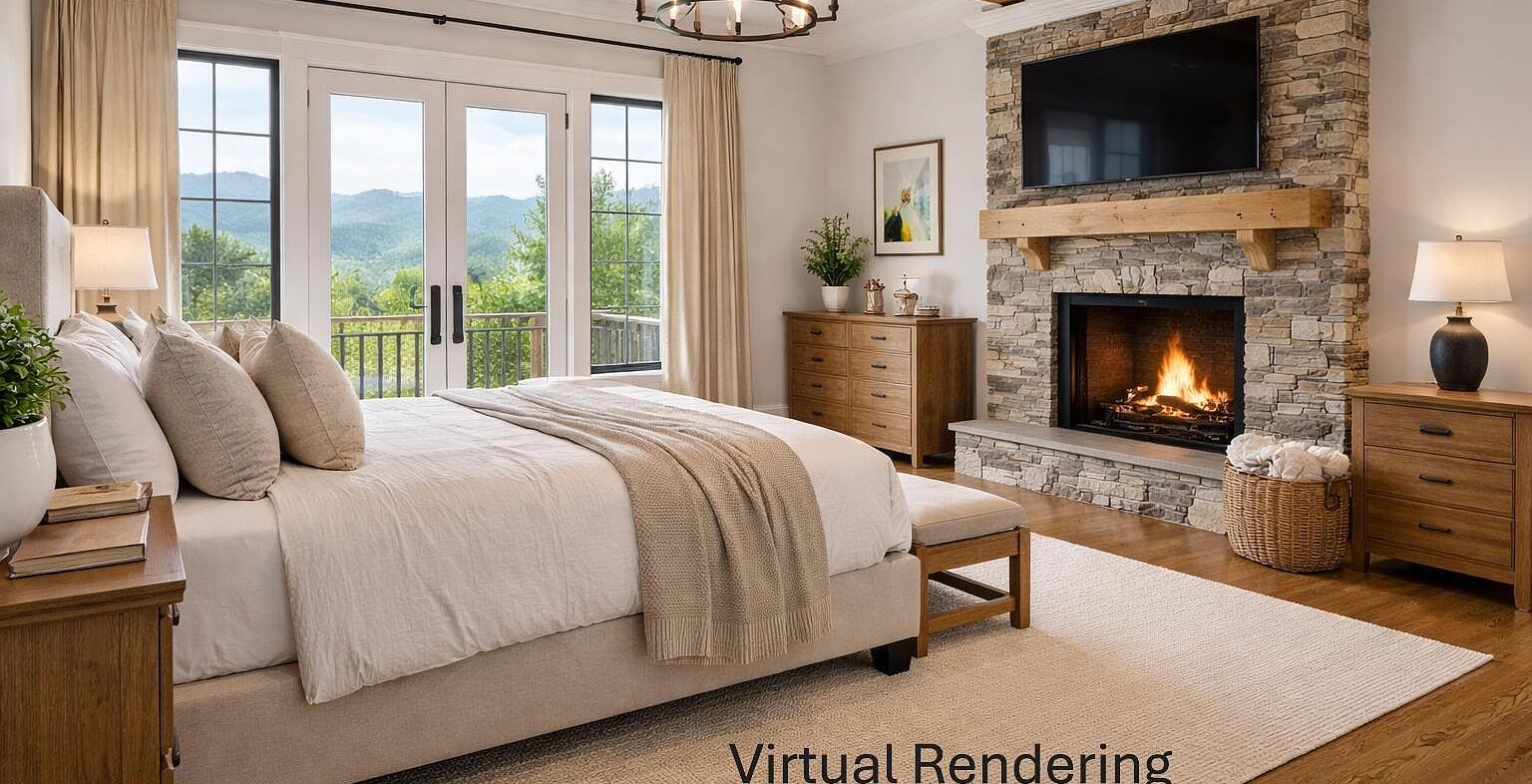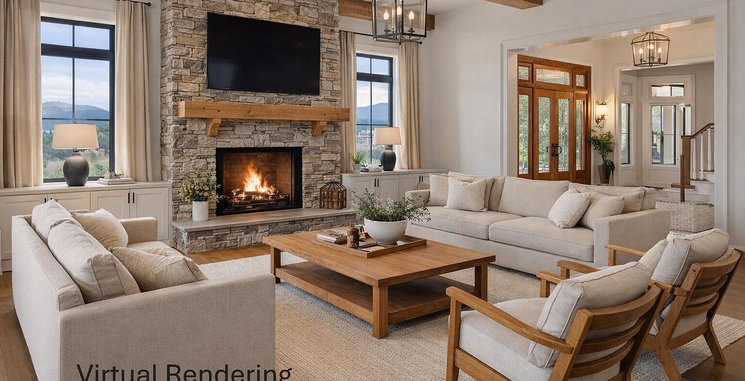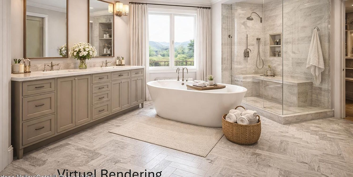 The heart of this modern farmhouse showcases a stunning floor-to-ceiling stone fireplace with rich wood mantel, creating a natural gathering place. Exposed ceiling beams and hardwood floors add warmth, while expansive windows frame breathtaking Catskill Mountain views. Built-in cabinetry provides practical storage, making this space both beautiful and functional for daily living.