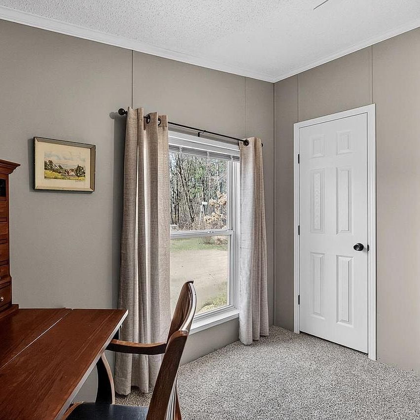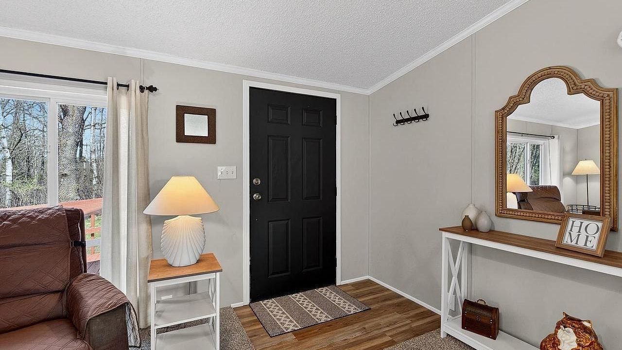 The heart of this home flows seamlessly from living to kitchen, creating the perfect backdrop for daily life. Crown molding adds character while sliding glass doors frame wooded views and connect you to the wraparound deck. The open layout maximizes every square foot of this 1,177 sq ft home, with the modern kitchen's breakfast bar becoming a natural gathering spot.