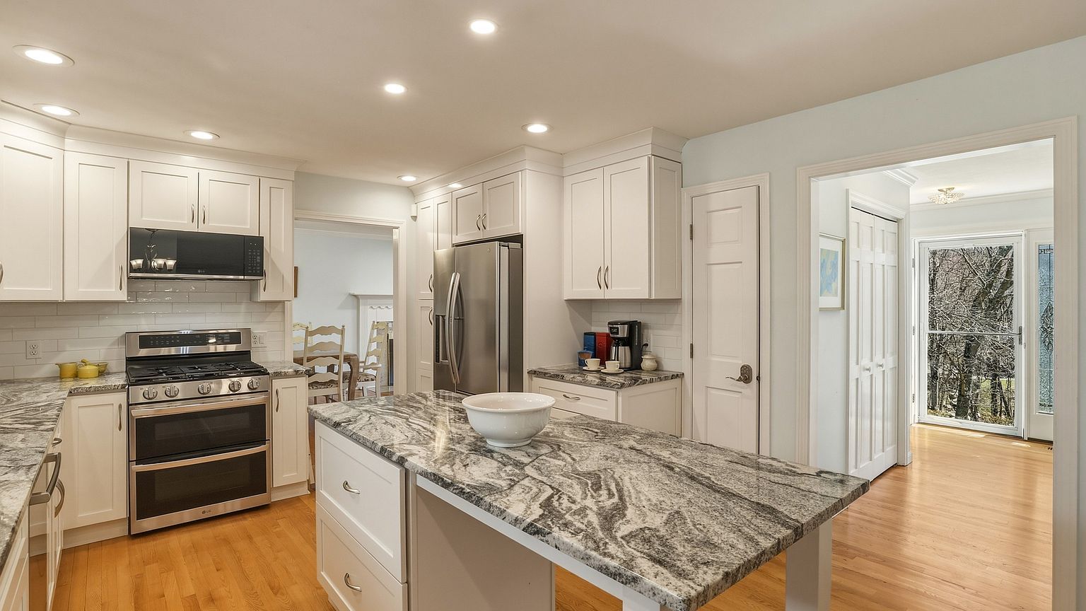 This enchanting screened sunroom spans the length of your home, blending indoor comfort with outdoor tranquility through floor-to-ceiling windows framing serene woodland views. Natural light pours through skylights above, creating an airy atmosphere perfect for morning coffee, afternoon reading, or evening relaxation while enjoying your lovely gardens and natural surroundings year-round.