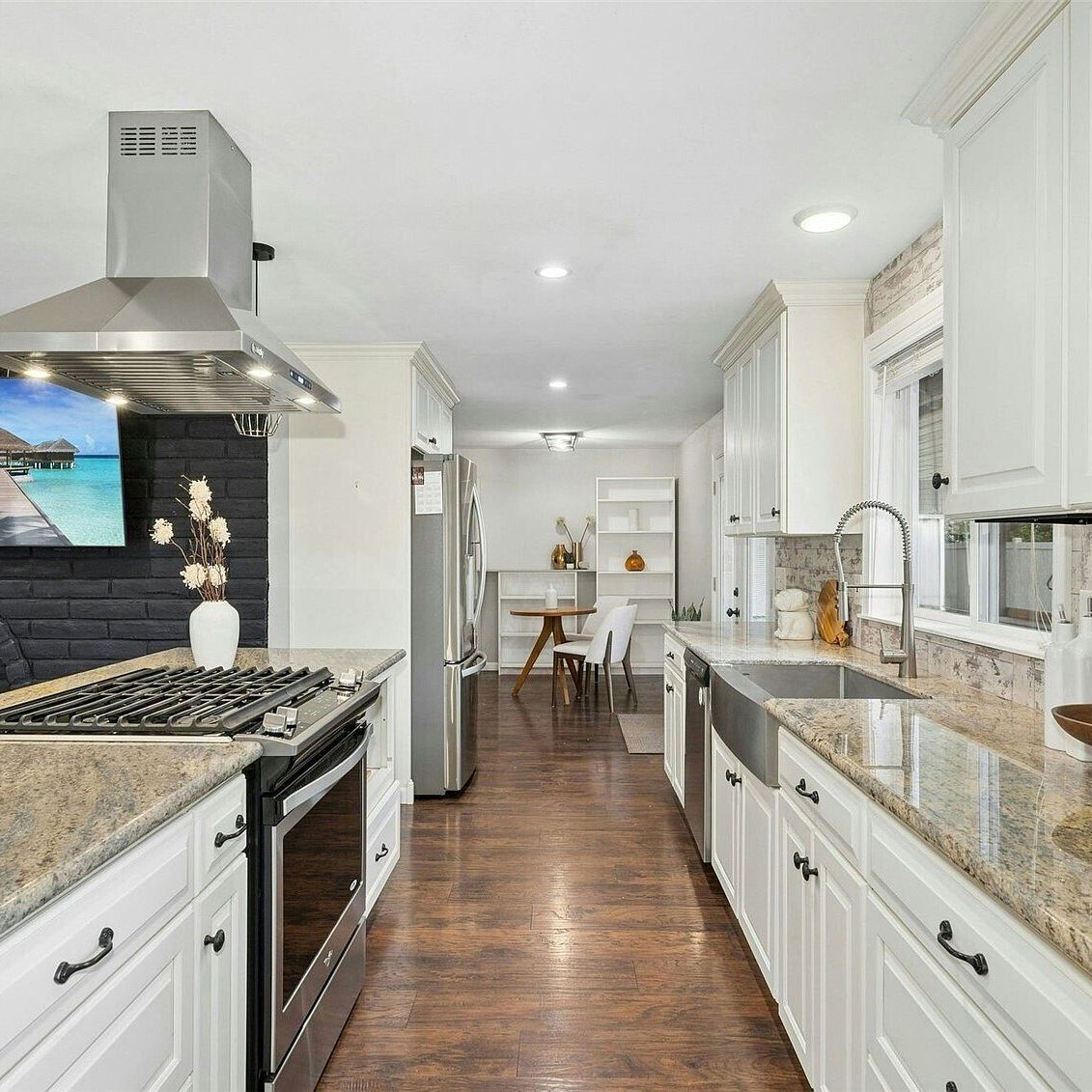 Meal preparation is made pleasing in this carefully designed kitchen with its perfect blending of farmhouse charm and modern function. Crisp white cabinetry embellished with beadboard details pairs elegantly with a weathered wood-look backsplash and lustrous granite countertops. The centerpiece island, housing appliances within its granite slab, completes the picture while stainless steel elements add durability.