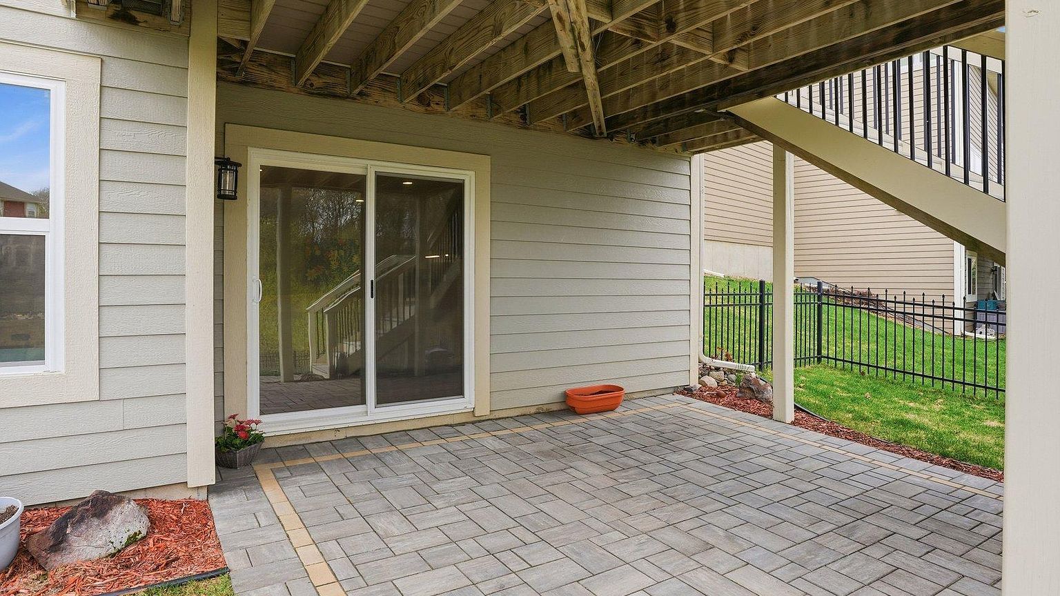 This sunlit living space becomes the heart of daily life, where vaulted ceilings amplify natural light streaming through expansive windows. The stone-surround fireplace with wood mantel anchors the room, while custom built-ins provide both function and style. Rich hardwood flows seamlessly into adjacent spaces, creating an open layout perfect for both quiet evenings and lively gatherings.