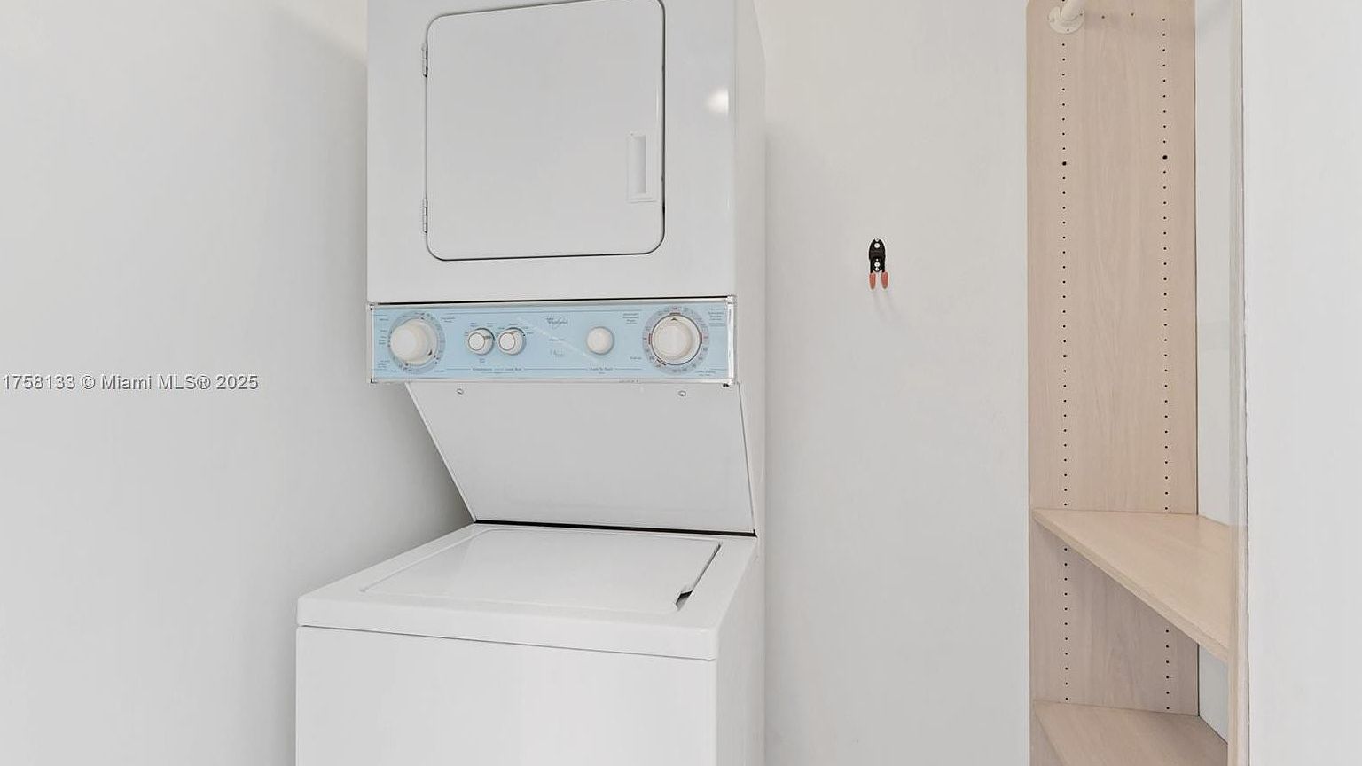 This compact laundry space maximizes vertical efficiency with a stacked washer-dryer unit featuring intuitive front-loading controls. Adjacent pegboard shelving provides customizable storage solutions, while clean white walls create a bright, practical environment for tackling household tasks with ease in this well-appointed residence.