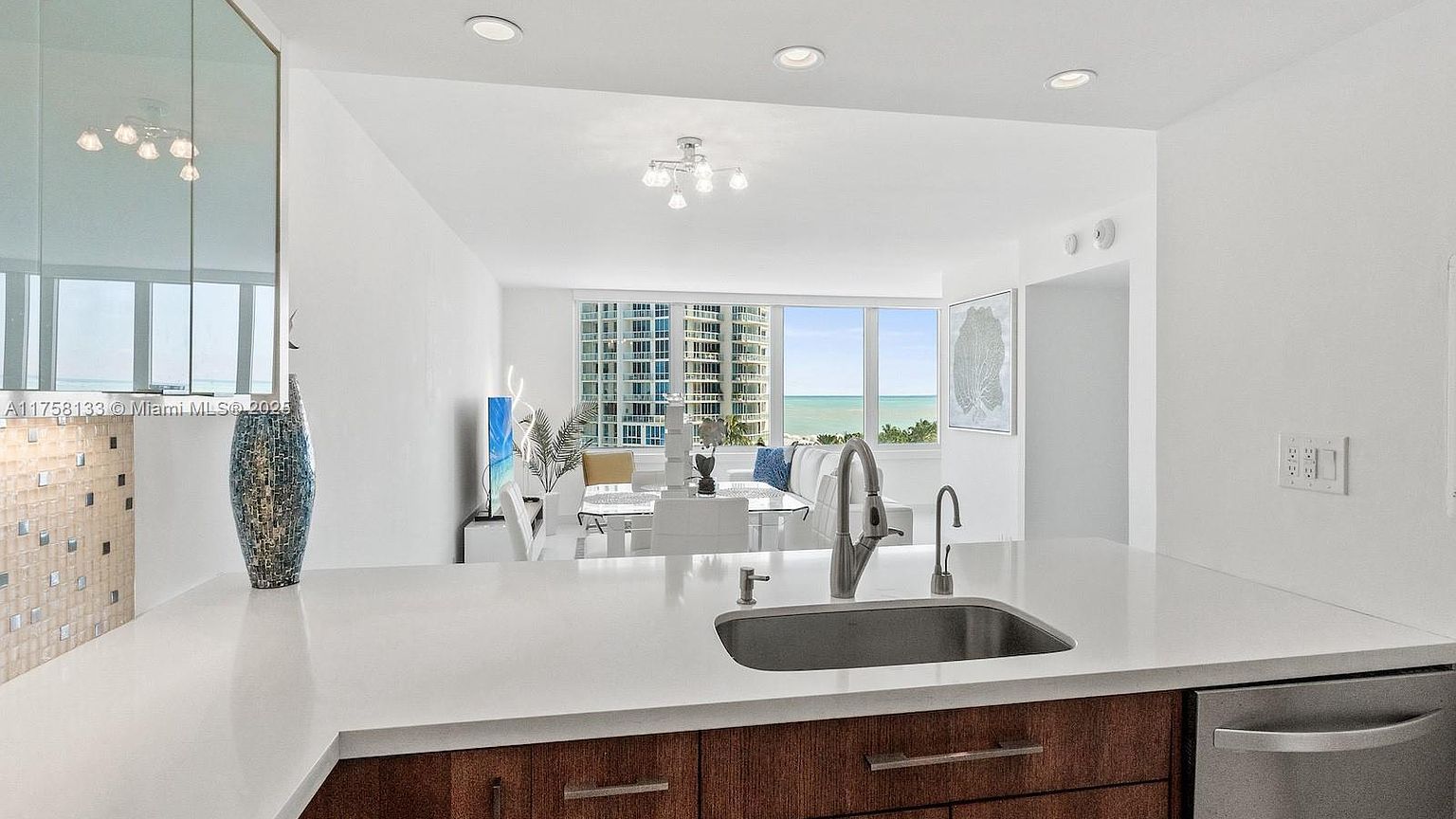 This sophisticated kitchen embraces modern minimalism with pristine white quartz countertops flowing seamlessly across rich espresso cabinetry. An undermount sink with contemporary faucet anchors the expansive counter workspace, while mosaic tile backsplash adds subtle textural intrigue. The open layout flows effortlessly into dining and living areas, where floor-to-ceiling windows frame breathtaking ocean vistas from every angle.