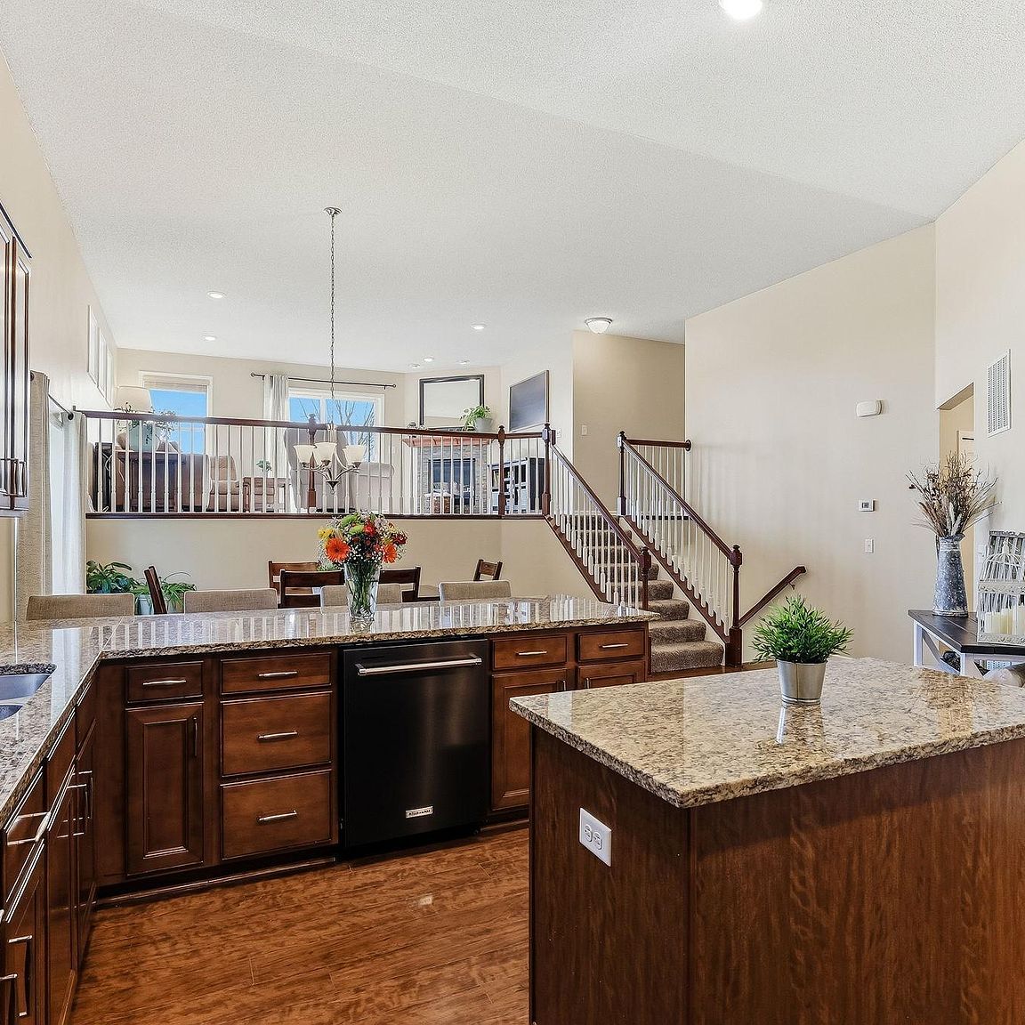 This thoughtfully designed 2,817 square foot multi-level split welcomes you with a bright, open layout and warm, neutral tones. The inviting living room features a gas fireplace with a handsome stacked stone surround, creating a cozy focal point for Minnesota winters. Expansive sliding glass doors connect seamlessly to a premium Trex deck (2019), offering a perfect flow for indoor-outdoor entertaining while maintaining distinct zones for all your family activities.
